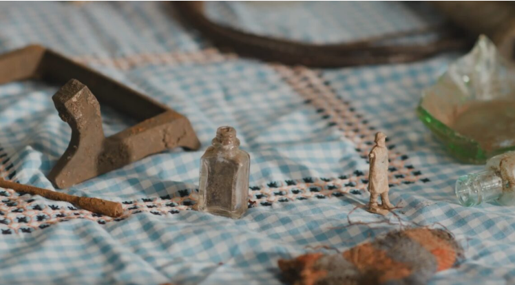 The found artefacts – or clues dug up from the past – include a toy farmer figure from the 1920s-1940s, a swatch of knitted fabric, old bottles and shards of green glass.