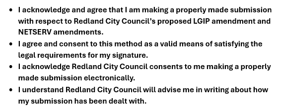 By submitting this form you acknowledge and agree that you are making a properly made submissions with respect to Redland City Council’s proposed LGIP and NETSERV amendment.